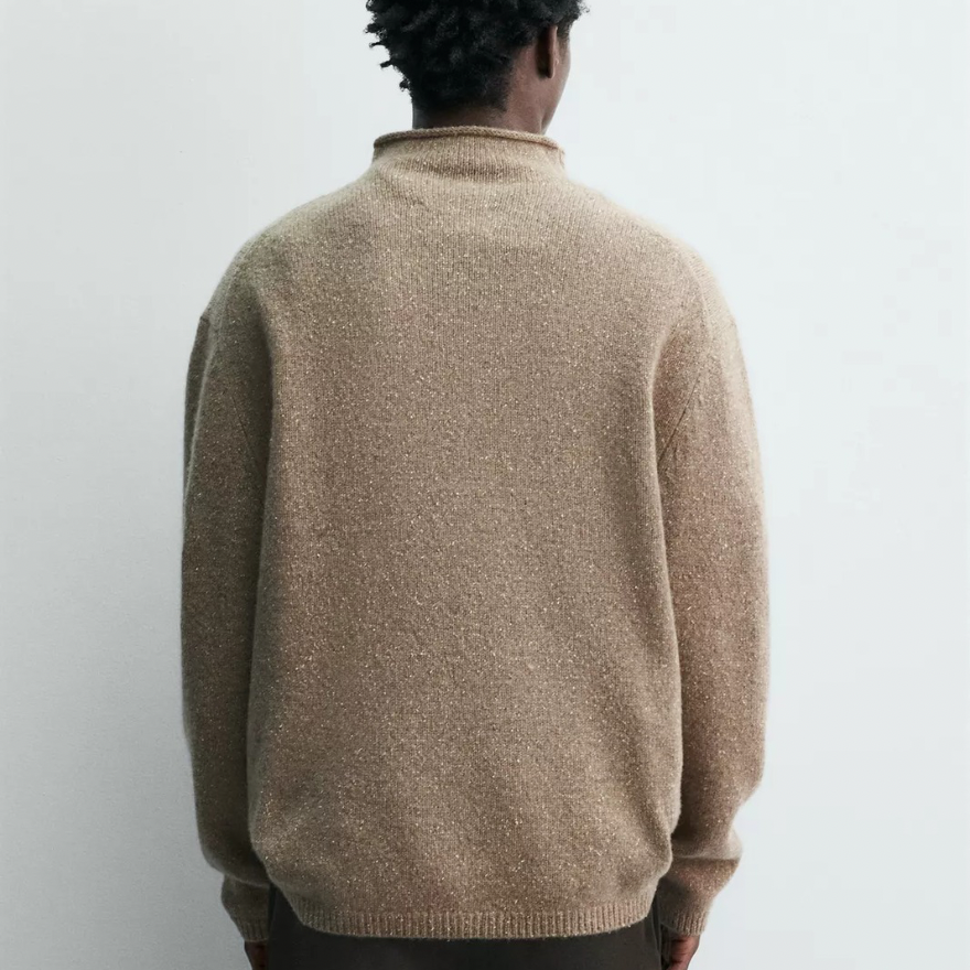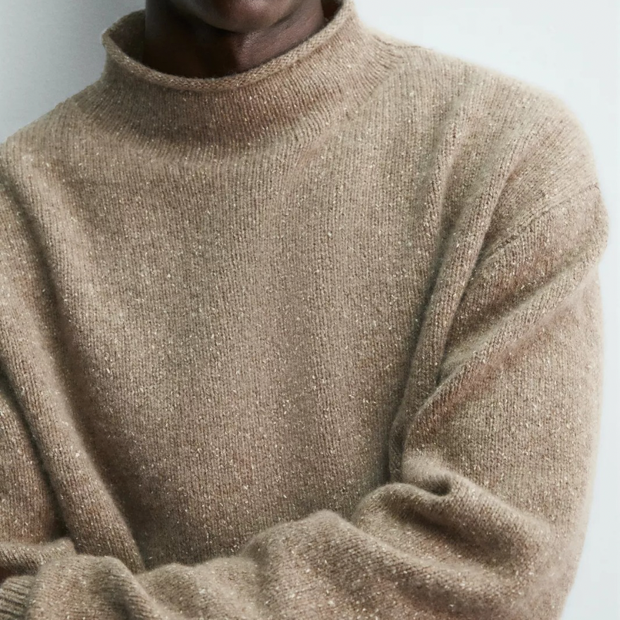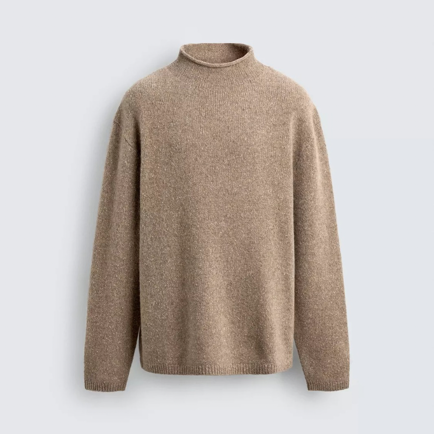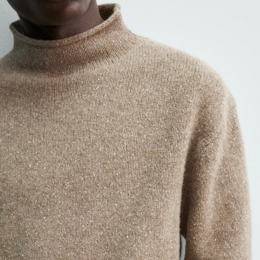 Regular fit knit sweater made from a wool and 20% silk blend yarn. Featuring a high neck with a rolled ribbed trim. Long sleeves. Ribbed trims.